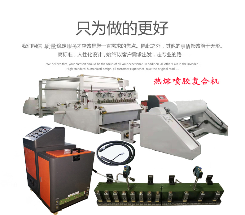 主用适用于:无纺布、薄膜、织物、纸卷、皮革、泡棉等材料上进行喷热熔胶后进行复合。喷胶量的大小可根据用户需求设定。